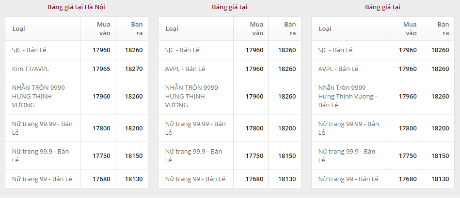 Giá vàng tại Công ty TNHH MTV Vàng bạc đá quý Sài Gòn (SJC):