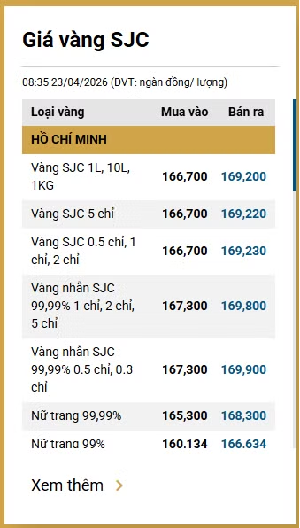 Tại Việt Nam, vào sáng 23/4, công ty Vàng bạc đá quý Sài Gòn niêm yết giá vàng SJC tại thị trường Hà Nội ở mức 166,7 - 169,2 triệu đồng/lượng (mua vào - bán ra).