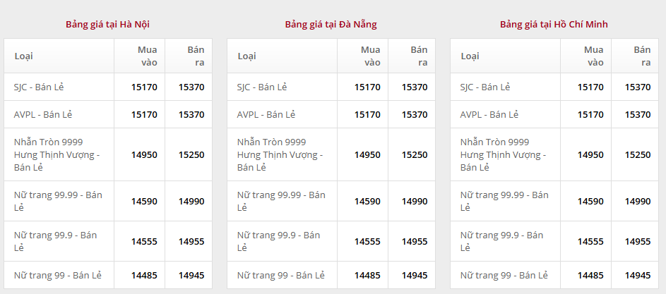 Giá vàng tại Công ty TNHH MTV Vàng bạc đá quý Sài Gòn (SJC):