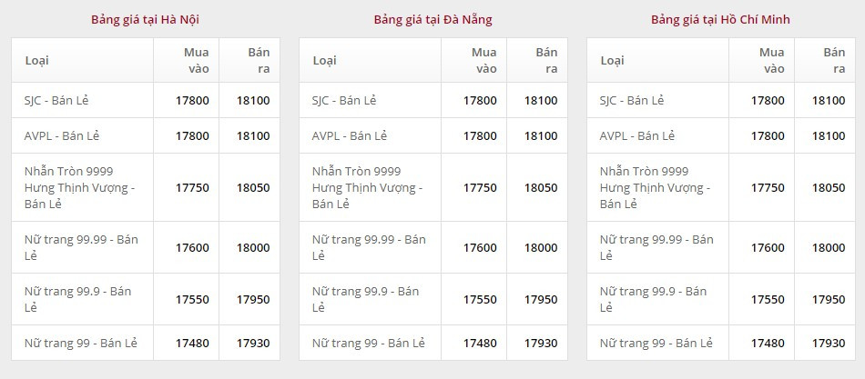 Giá vàng tại Công ty TNHH MTV Vàng bạc đá quý Sài Gòn (SJC):