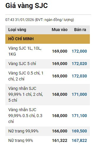 Tại Việt Nam, sáng 1/2, giá vàng SJC tại thị trường Hà Nội được Công ty Vàng bạc đá quý Sài Gòn niêm yết ở mức 169 - 172 triệu đồng/lượng (mua vào - bán ra).