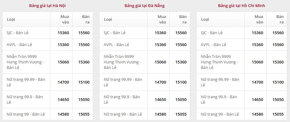 Giá vàng tại Công ty TNHH MTV Vàng bạc đá quý Sài Gòn (SJC):