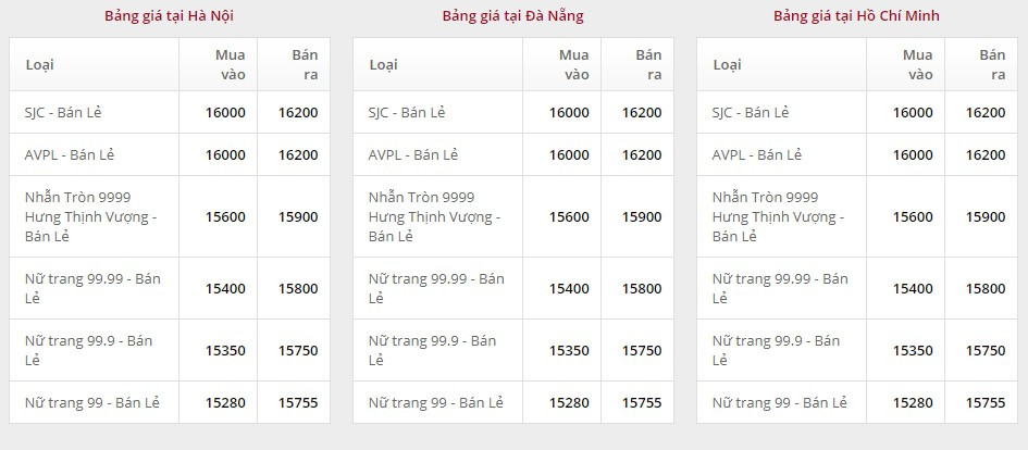 Giá vàng tại Công ty TNHH MTV Vàng bạc đá quý Sài Gòn (SJC):