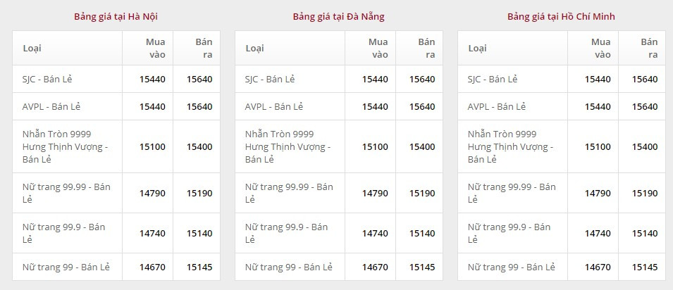 Giá vàng tại Công ty TNHH MTV Vàng bạc đá quý Sài Gòn (SJC):