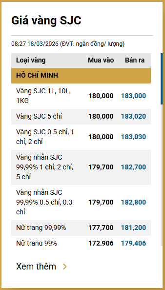 Tại Việt Nam, sáng 18/3, giá vàng SJC được Công ty Vàng bạc đá quý Sài Gòn niêm yết ở mức 180 - 183 triệu đồng/lượng (mua vào - bán ra).