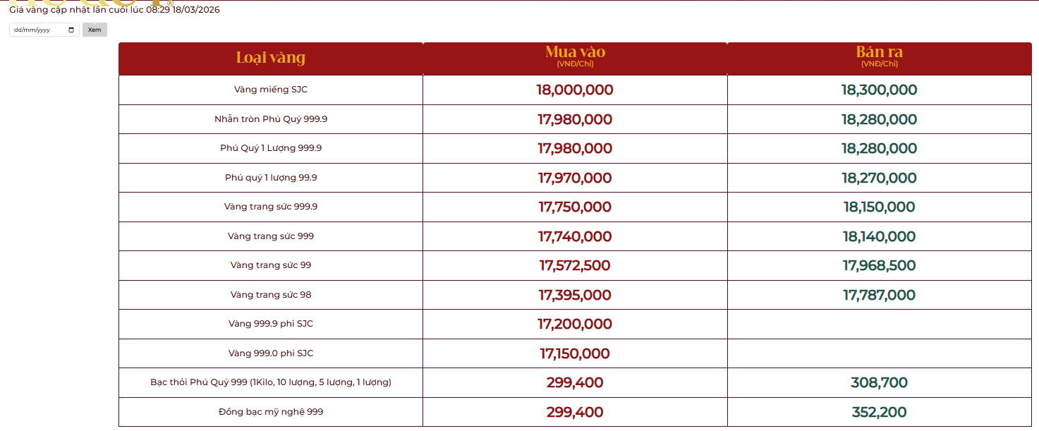 Dưới đây là bảng giá vàng tại một số công ty vàng bạc đá quý trong nước sáng 18/3: