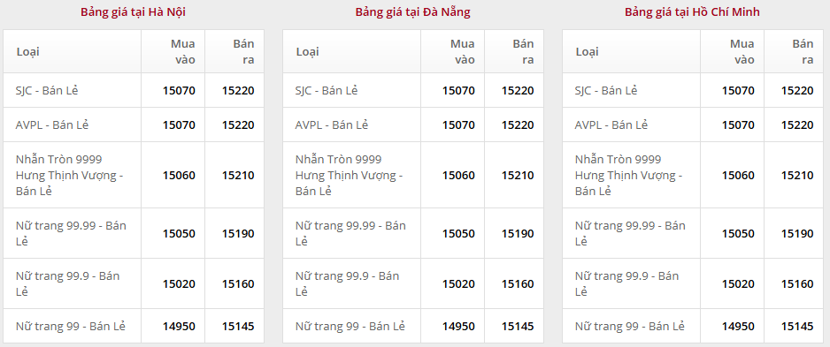 Giá vàng tại Công ty TNHH MTV Vàng bạc Đá quý Sài Gòn (SJC):