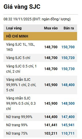 Tại Việt Nam, vào đầu giờ sáng 19/11, Công ty Vàng bạc đá quý Sài Gòn SJC và Tập đoàn DOJI niêm yết giá vàng miếng ở mức 147,3 - 149,3 triệu đồng/lượng (mua vào - bán ra).