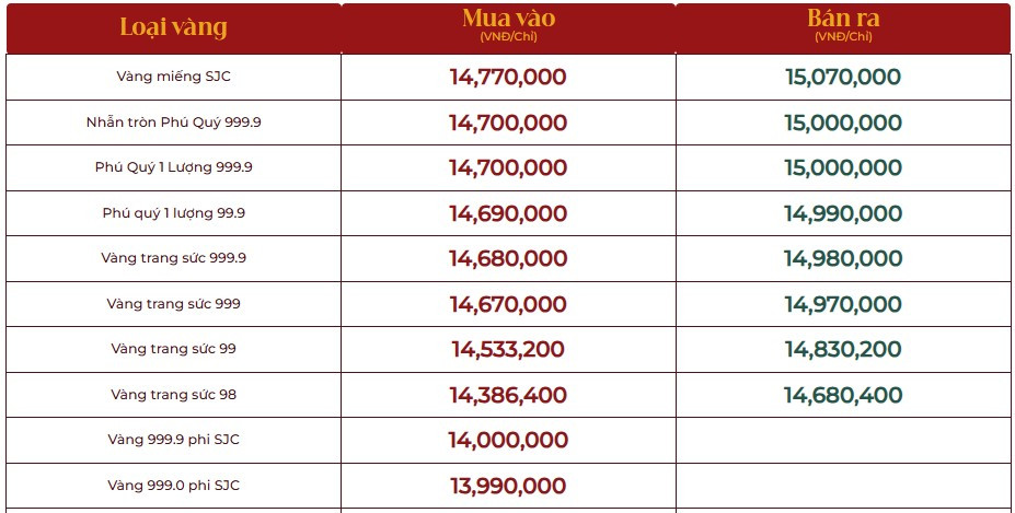 Giá vàng tại Công ty CP Đầu tư vàng Phú Quý: