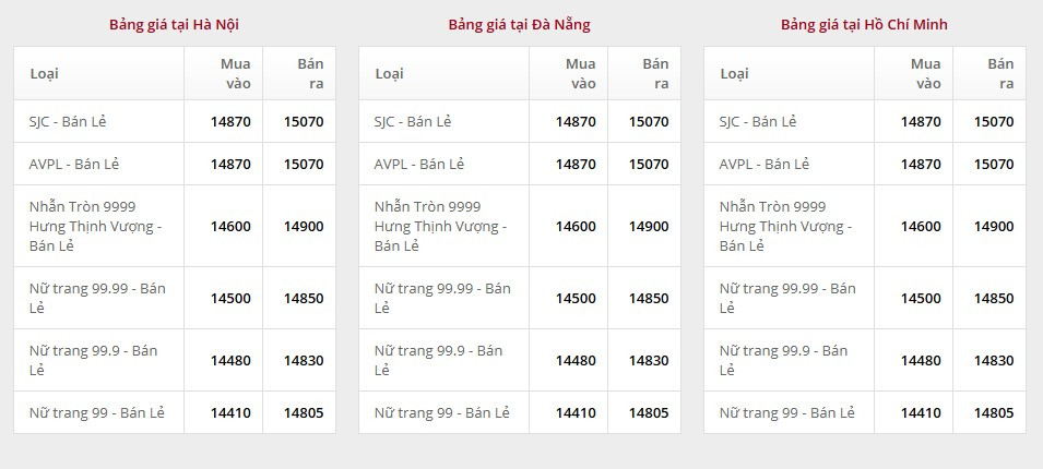 Giá vàng tại Công ty TNHH MTV Vàng bạc đá quý Sài Gòn (SJC):