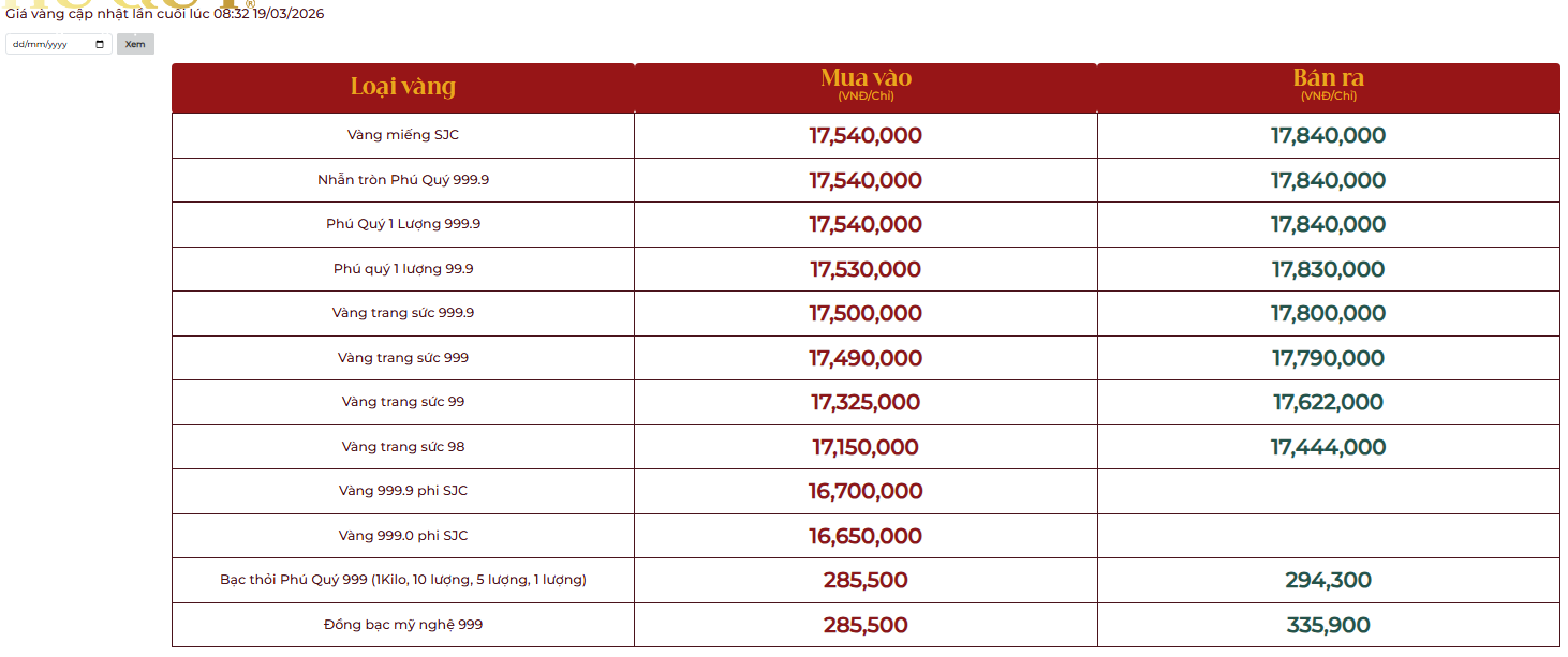 Dưới đây là bảng giá vàng tại một số công ty vàng bạc đá quý trong nước sáng 19/3: