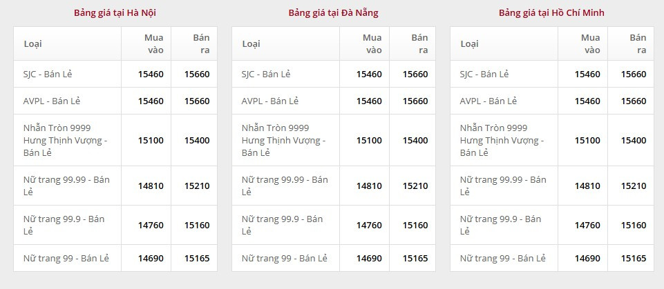 Giá vàng tại Công ty TNHH MTV Vàng bạc đá quý Sài Gòn (SJC):