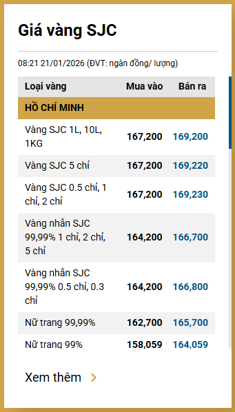 Tại Việt Nam, sáng 21/1, giá vàng SJC tại thị trường Hà Nội được Công ty Vàng bạc đá quý Sài Gòn niêm yết ở mức 167,2 - 169,2 triệu đồng/lượng (mua vào - bán ra).