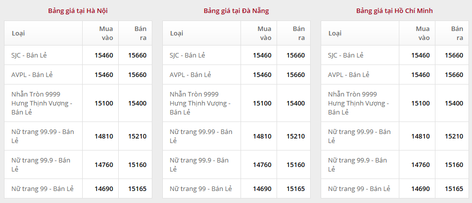 Giá vàng tại Công ty TNHH MTV Vàng bạc đá quý Sài Gòn (SJC):