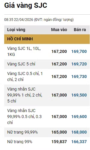 Tại Việt Nam, vào đầu giờ sáng 22/4, Công ty Vàng bạc Đá quý Sài Gòn niêm yết giá vàng SJC ở mức 168,1 - 170,6 triệu đồng/lượng (mua vào - bán ra).