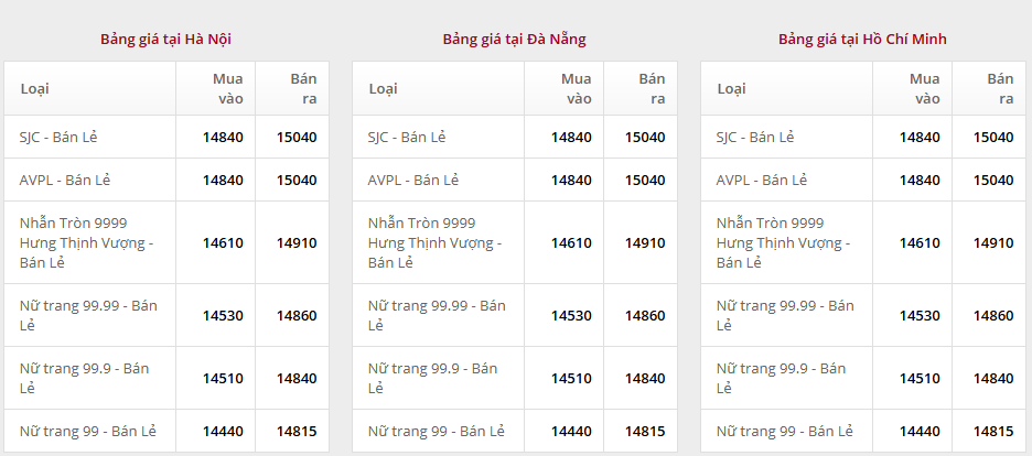 Tại Việt Nam, Công ty Vàng bạc đá quý Sài Gòn SJC niêm yết giá vàng miếng ở mức 148,4 - 150,4 triệu đồng/lượng (mua vào - bán ra).