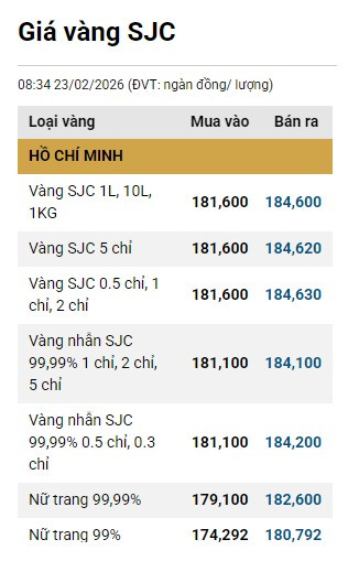 Dưới đây là bảng giá vàng tại một số công ty vàng bạc đá quý trong nước sáng 23/2: