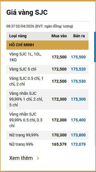 Tại Việt Nam, sáng 2/4, giá vàng SJC được Công ty Vàng bạc đá quý Sài Gòn niêm yết ở mức 172,5 - 175,5 triệu đồng/lượng (mua vào - bán ra).