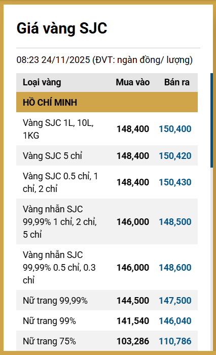 Tại Việt Nam, sáng ngày 24/11, Công ty Vàng bạc đá quý Sài Gòn SJC niêm yết giá vàng miếng ở mức 148,4 - 150,4 triệu đồng/lượng (mua vào - bán ra).