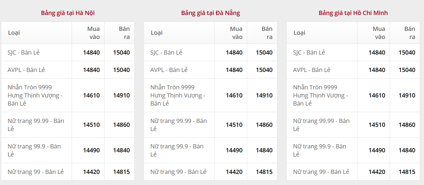 Giá vàng tại Công ty TNHH MTV Vàng bạc đá quý Sài Gòn (SJC):