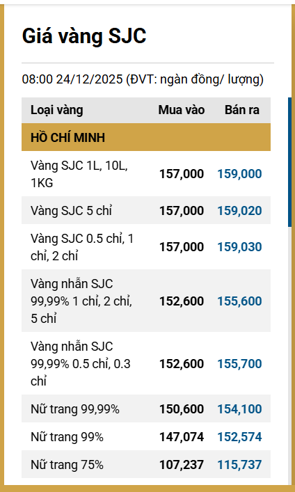 Tại Việt Nam, sáng 24/12, giá vàng SJC tại thị trường Hà Nội được Công ty Vàng bạc đá quý Sài Gòn niêm yết ở mức 157 - 159 triệu đồng/lượng (mua vào - bán ra).