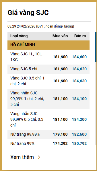 Tại Việt Nam, sáng 24/2, giá vàng SJC tại thị trường Hà Nội được Công ty Vàng bạc đá quý Sài Gòn niêm yết ở mức 181,6 - 184,6 triệu đồng/lượng (mua vào - bán ra).