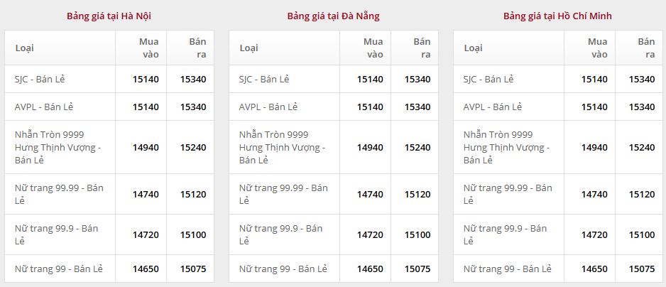 Giá vàng tại Công ty TNHH MTV Vàng bạc đá quý Sài Gòn (SJC):