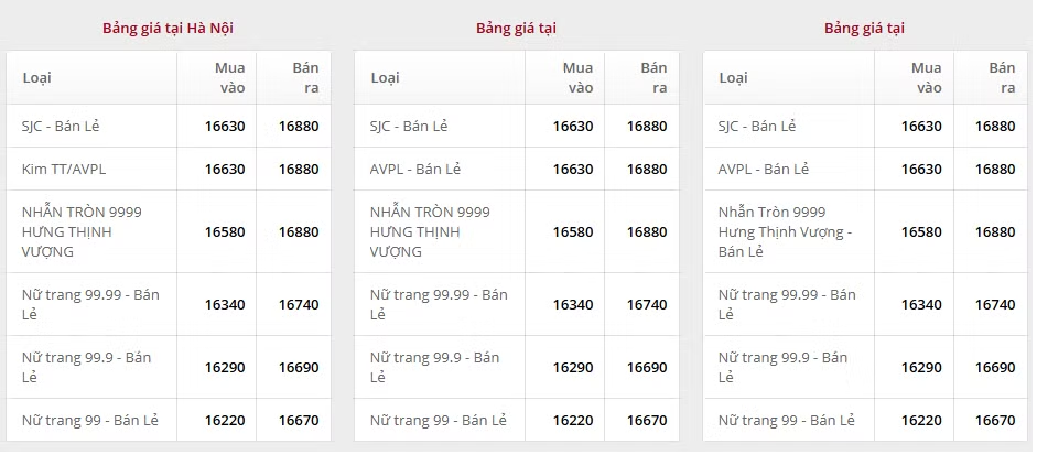 Giá vàng tại Công ty TNHH MTV Vàng bạc đá quý Sài Gòn (SJC):