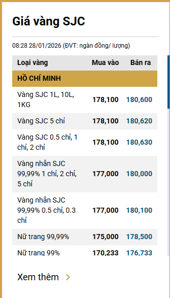 Tại Việt Nam, sáng 28/1, giá vàng SJC tại thị trường Hà Nội được Công ty Vàng bạc đá quý Sài Gòn niêm yết ở mức 178,1 - 180,6 triệu đồng/lượng (mua vào - bán ra).