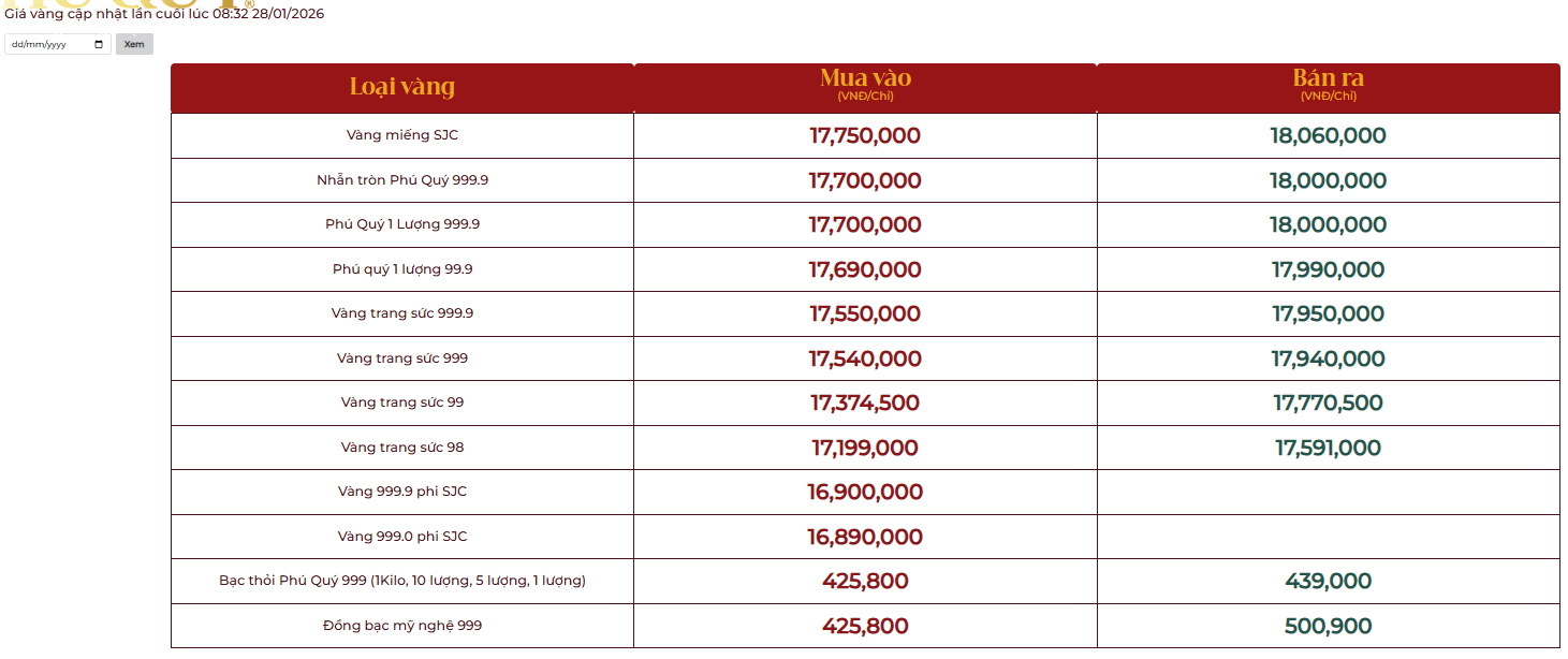 Cập nhật bảng giá vàng ngày 28/1 tại Công ty TNHH MTV Vàng bạc Đá quý Sài Gòn (SJC), Công ty CP Đầu tư vàng Phú Quý.