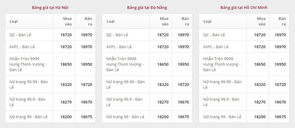 Giá vàng tại Công ty TNHH MTV Vàng bạc đá quý Sài Gòn (SJC):