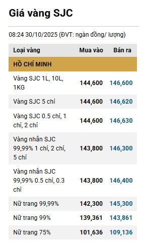 Dưới đây là bảng giá vàng tại một số công ty vàng bạc đá quý trong nước sáng 30/10: