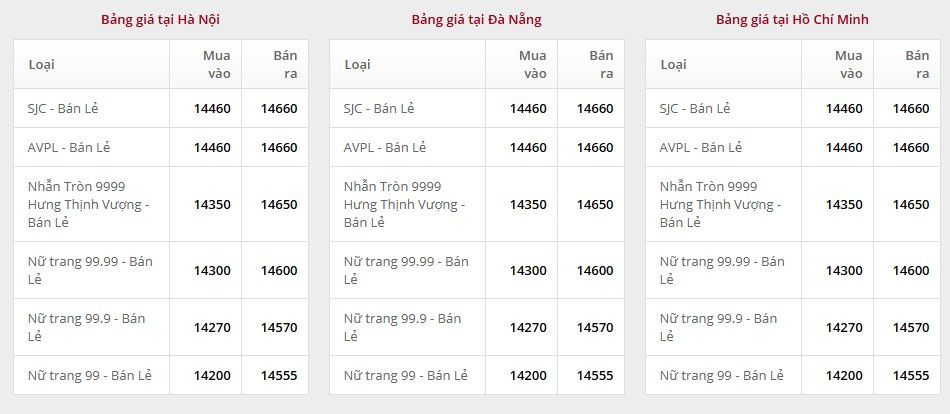 Giá vàng tại Công ty TNHH MTV Vàng bạc đá quý Sài Gòn (SJC):