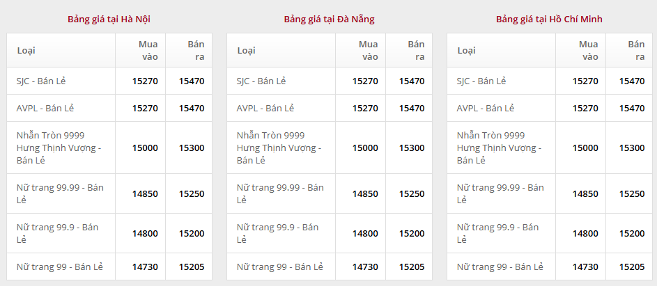 Giá vàng tại Công ty TNHH MTV Vàng bạc đá quý Sài Gòn (SJC):