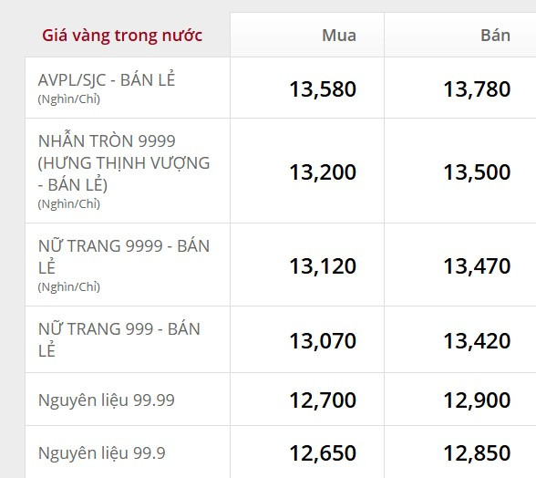 Giá vàng tại Công ty TNHH MTV Vàng bạc Đá quý Sài Gòn (SJC):
