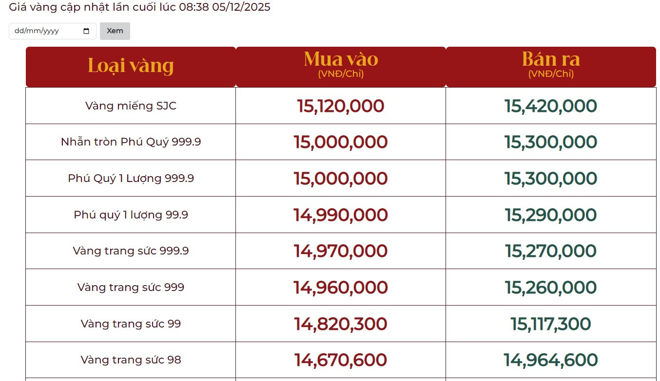 Dưới đây là bảng giá vàng tại một số công ty vàng bạc đá quý trong nước sáng 5/12: