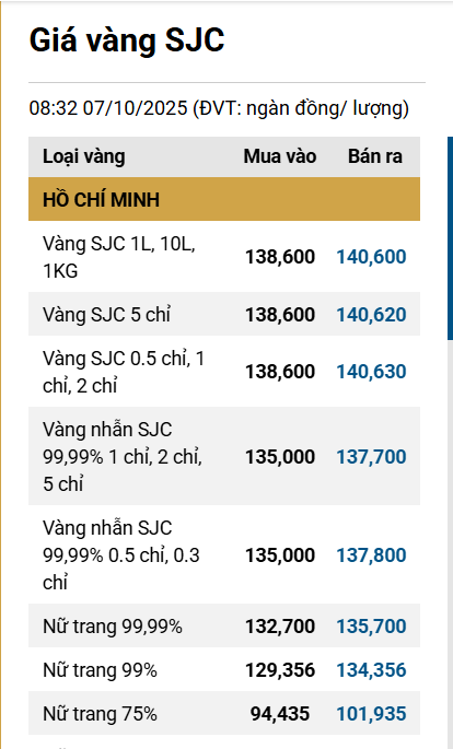 Tại Việt Nam, sáng 7/10, Công ty Vàng bạc đá quý Sài Gòn (SJC) niêm yết giá vàng miếng ở mức 138,6 - 140,6 triệu đồng/lượng (mua vào - bán ra).