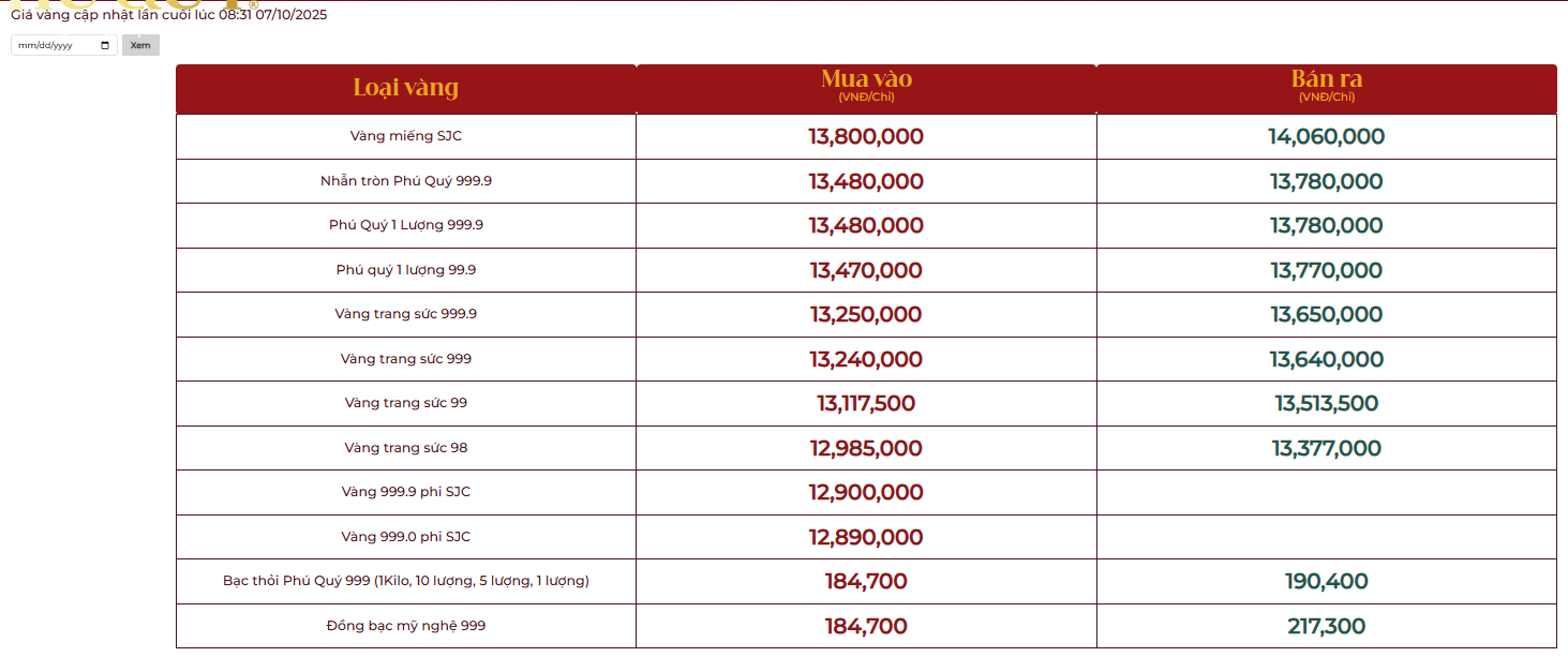 Cập nhật bảng giá vàng ngày 7/10 tại các công ty vàng bạc đá quý trong nước.