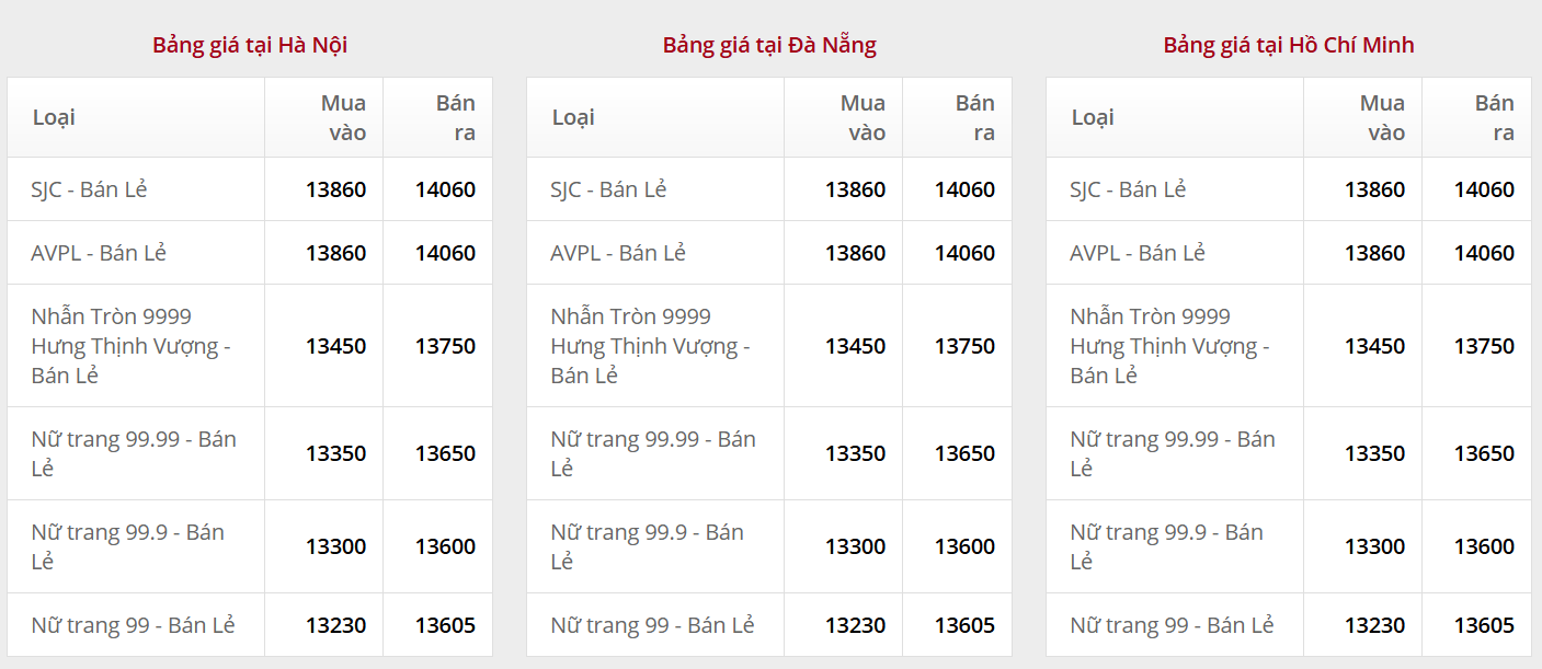 Giá vàng tại Công ty TNHH MTV Vàng bạc Đá quý Sài Gòn (SJC):