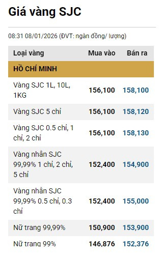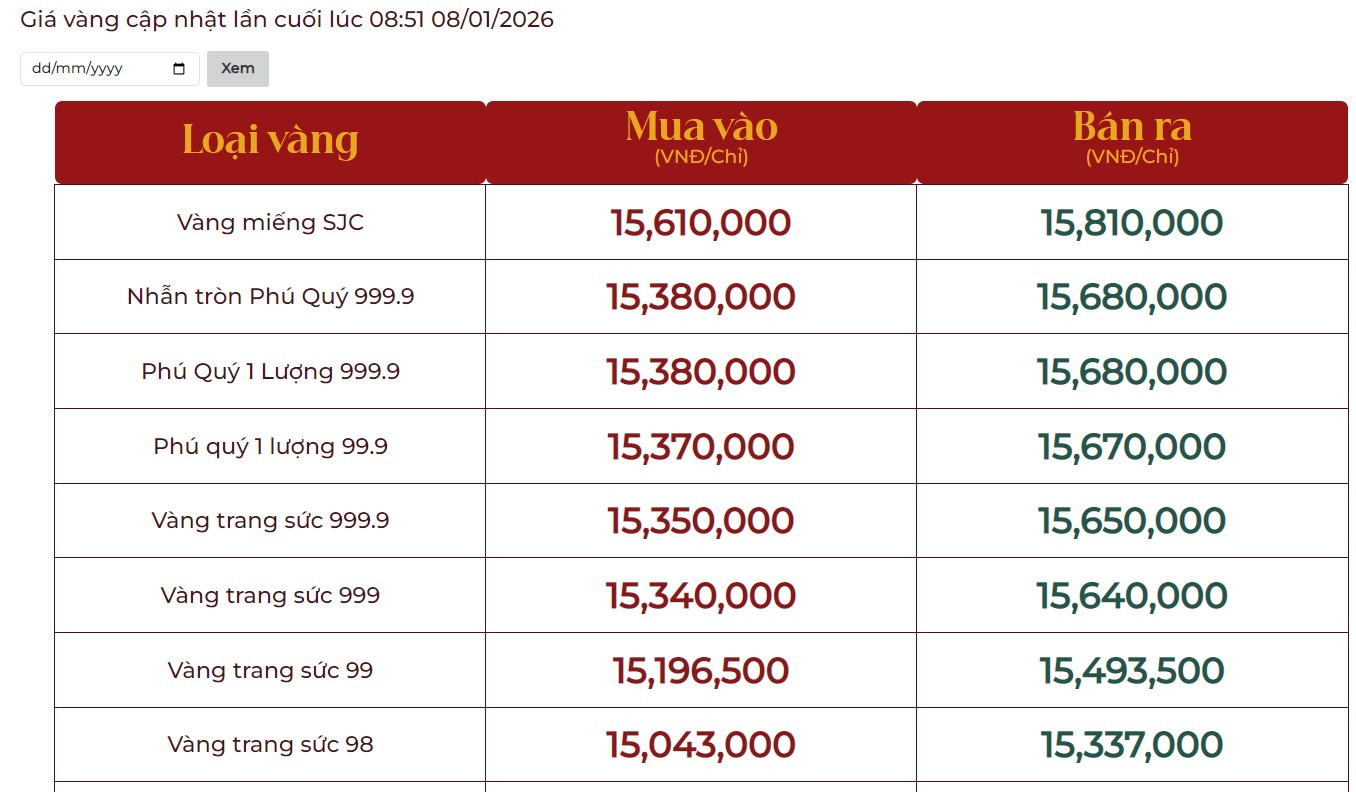 Cập nhật bảng giá vàng ngày 8/1 tại Công ty TNHH MTV Vàng bạc Đá quý Sài Gòn (SJC), Công ty CP Đầu tư vàng Phú Quý, Tập đoàn Vàng bạc Đá quý Doji.