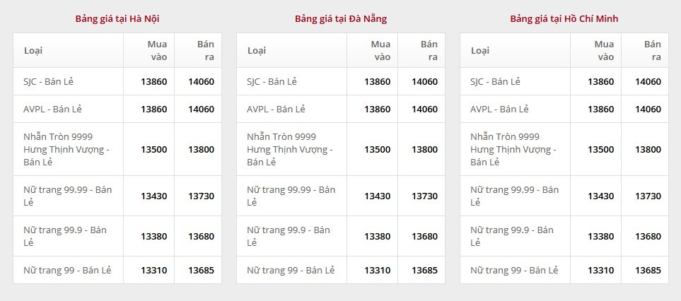 Giá vàng tại Công ty TNHH MTV Vàng bạc Đá quý Sài Gòn (SJC):