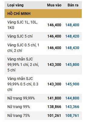 Tại Việt Nam, sáng 9/11, Công ty Vàng bạc Đá quý Sài Gòn niêm yết giá vàng SJC tại thị trường Hà Nội ở mức 146,4 - 148,4 triệu đồng/lượng (mua vào - bán ra).