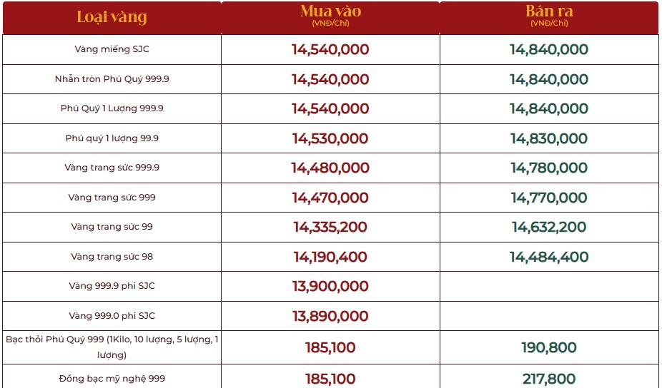 Giá vàng tại Công ty CP Đầu tư vàng Phú Quý: