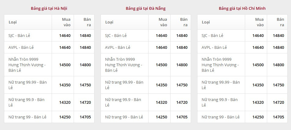 Giá vàng tại Công ty TNHH MTV Vàng bạc đá quý Sài Gòn (SJC):