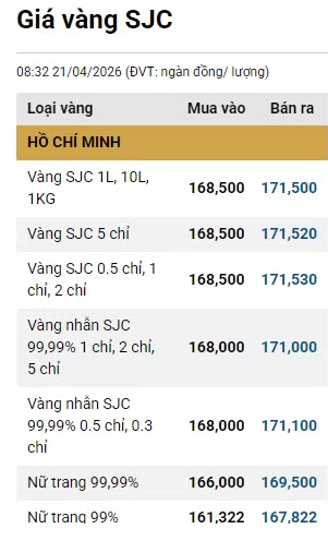 Tại Việt Nam cuối ngày 20/4, công ty Vàng bạc đá quý Sài Gòn niêm yết giá vàng SJC tại thị trường Hà Nội ở mức 168,3 - 171,3 triệu đồng/lượng (mua vào - bán ra).