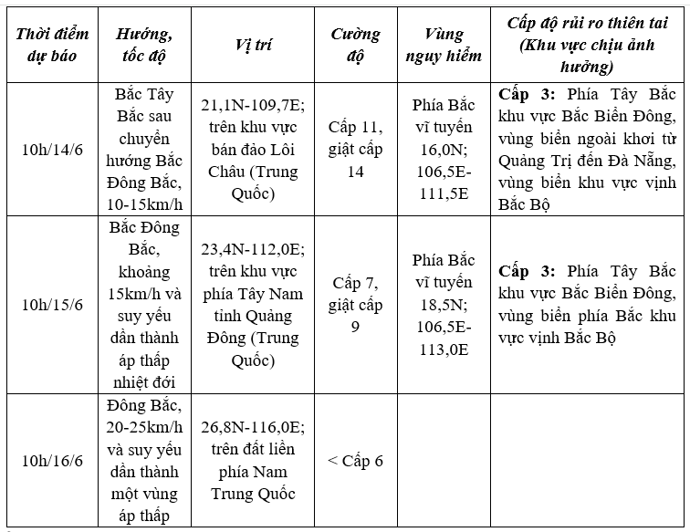 Trung tâm Dự báo khí tượng thủy văn quốc gia cho biết, hồi 10 giờ ngày 13/6, vị trí tâm bão ở vào khoảng 18,4 độ Vĩ Bắc; 108,5 độ Kinh Đông, trên vùng biển phía Tây Nam đảo Hải Nam (Trung Quốc). Sức gió mạnh nhất vùng gần tâm bão mạnh cấp 11 (103 - 117km/h), giật cấp 14; di chuyển theo hướng Bắc Tây Bắc với tốc độ 10 - 15km/h.
