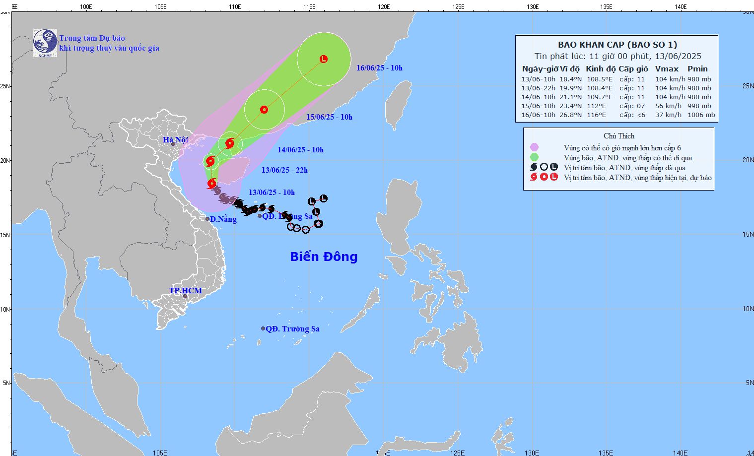 Dự báo quỹ đạo và cường độ bão số 1 lúc 11 giờ ngày 13/6/2025