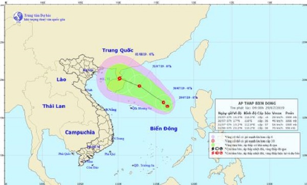 Dự báo trong 24 giờ tới, vùng áp thấp ít dịch chuyển và có khả năng mạnh lên thành áp thấp nhiệt đới. Đến 7 giờ ngày 30/7, vị trí tâm áp thấp nhiệt đới ở khoảng 17,0 độ Vĩ Bắc; 116,0 độ Kinh Đông, cách quần đảo Hoàng Sa khoảng 400km về phía Đông. Sức gió mạnh nhất vùng gần tâm áp thấp nhiệt đới mạnh cấp 6 (40-50km/giờ), giật cấp 8.