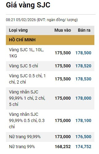 Tại Việt Nam, vào đầu giờ sáng 5/2, Công ty Vàng bạc đá quý Sài Gòn niêm yết giá vàng miếng SJC ở mức 177,2 - 180,2 triệu đồng/lượng (mua vào-bán ra).