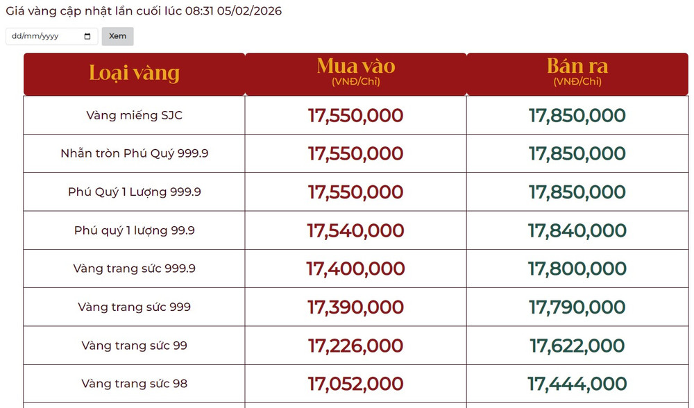 Dưới đây là bảng giá vàng tại một số công ty vàng bạc đá quý trong nước sáng 5/2: